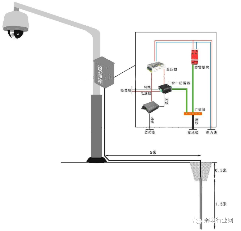 2、为防止雷电波沿线路侵入前端设备,应在设备前的每条线路上加装合适的避雷器,如电源线(AC220V 或 DC12V)、网线、控制线、开关线。