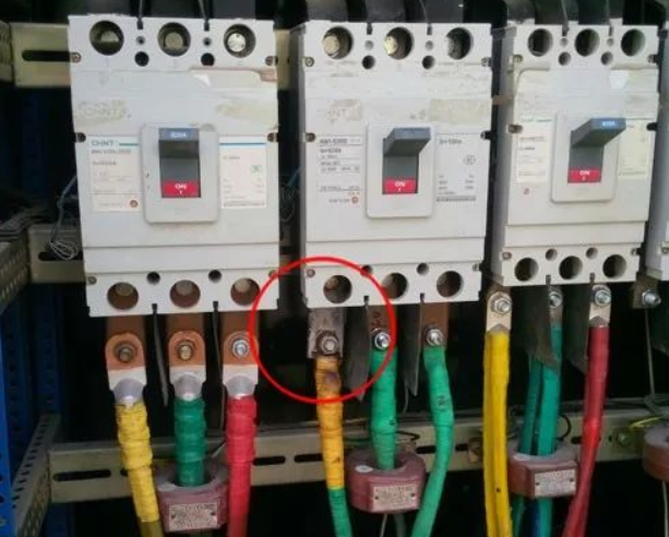 500千伏安箱变中630安断路器下的接线铜排,见图中左数第二个断路器,断路器塑壳上面此相对应区域温度明显高于其余两项对应区域,其余两相也发热,且此相铜排已经烧的变为了白色,没有感应钳形表并没有测各相电流,从现象判断应为偏相导致该相电流过高,但检查此箱变所带设备,均为三相的空压机、提升机、潜水泵等设备,仅有几盏碘钨灯而已,无法判断其偏相具体原因,求各位高手帮助分析!